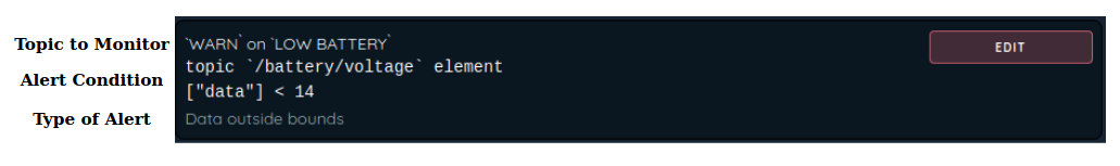 With this alert enabled, Freedom will monitor the topic /battery/voltage and listen to the element ["data"]. If the value goes below 14, the trigger is activated and an alert is generated.